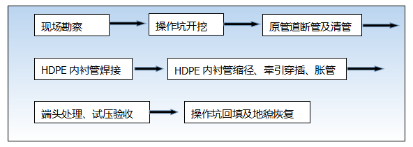 原理:通過對與修復(fù)管道同徑或略小一點的HDPE的縮徑、穿插、脹管等主要工序,實現(xiàn)修復(fù)管道內(nèi)形成與原管道內(nèi)壁緊密貼合的復(fù)合管。